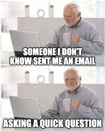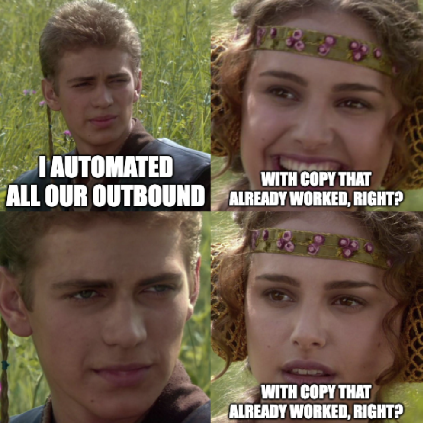 Outbound email, on the other hand, works more like a swarm of door-knocking drones controlled by one pilot. Drones don’t care about the door being slammed on their face. And the bottleneck to success becomes the quality of the drone pilot, who is now responsible for 100x or 1000x more conversations than that previous human door knocker.